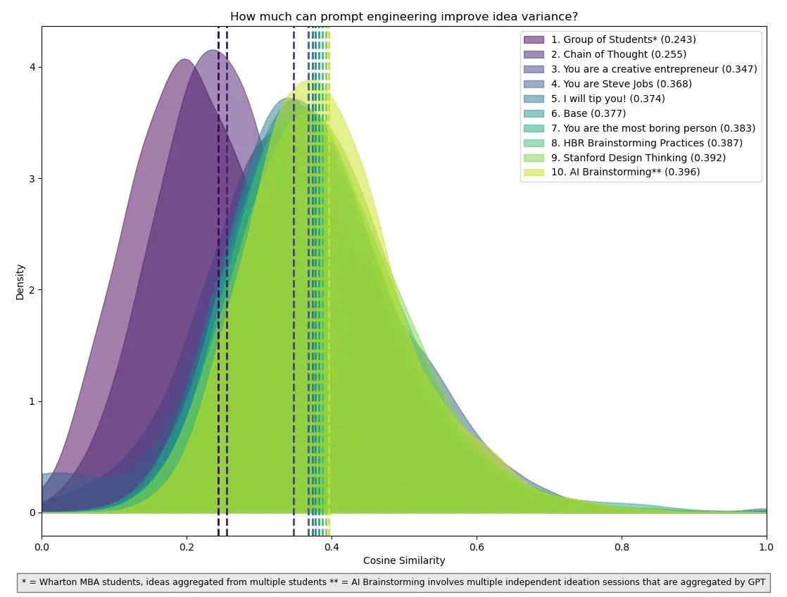 Source: “Prompting Diverse Ideas: Increasing AI Idea Variance” by Lennart Meincke, Christian Terwiesch and Ethan Mollick. As the authors say: